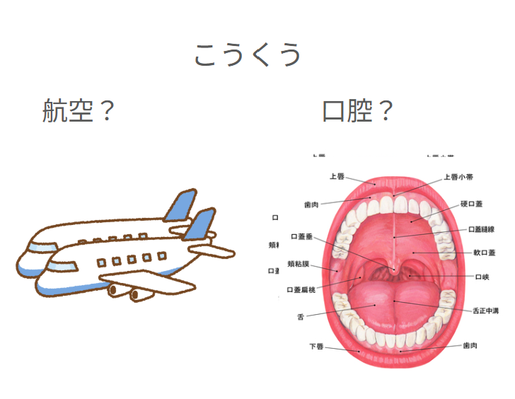 こうくう「口腔」を説明するのに「航空」って、JALとかANAでしょう?と突っ込んでくる。(笑)