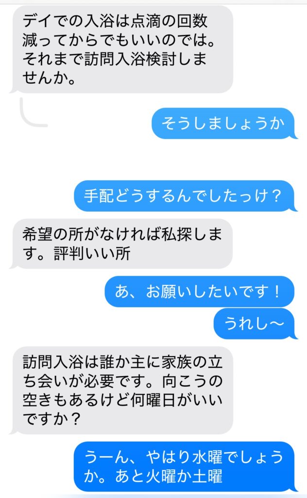 そしてケアマネさんから訪問入浴の提案。往生際悪くデイでと思ってたけどまずは訪問でと提案いただき、オススメのところを上げてもらった。それが今ムッチャ頑張ってくれている訪看さんと同じオススメの場所だそうで、そりゃ心強いよね。