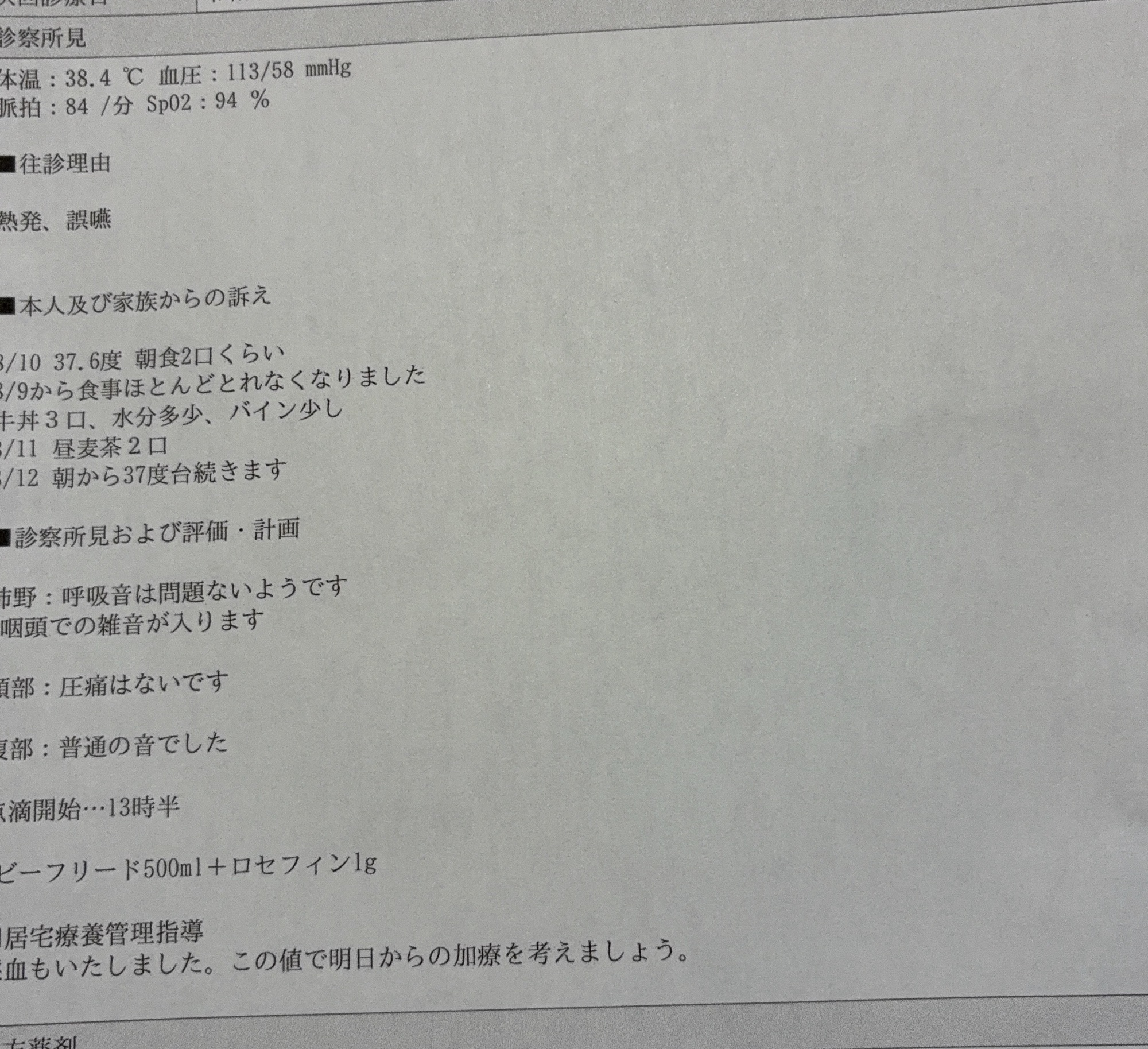 体温:38.4/SPO:94/ノドの音:ゼコゼコ/脈:84/血圧113-28